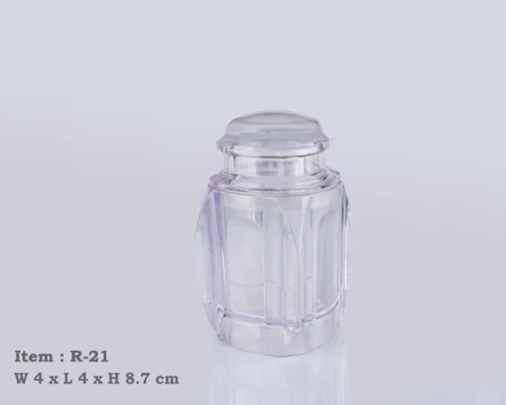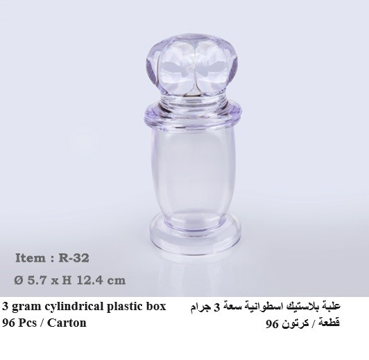 علبة بلاستيك كريستال اسطوانية سعة 1.5 جرام اسم الصنف :R-21 - CLEAR - 144 Pcs / Carton التعبئـــــــة : 144 حبة الوحـــــــدة : كرتون