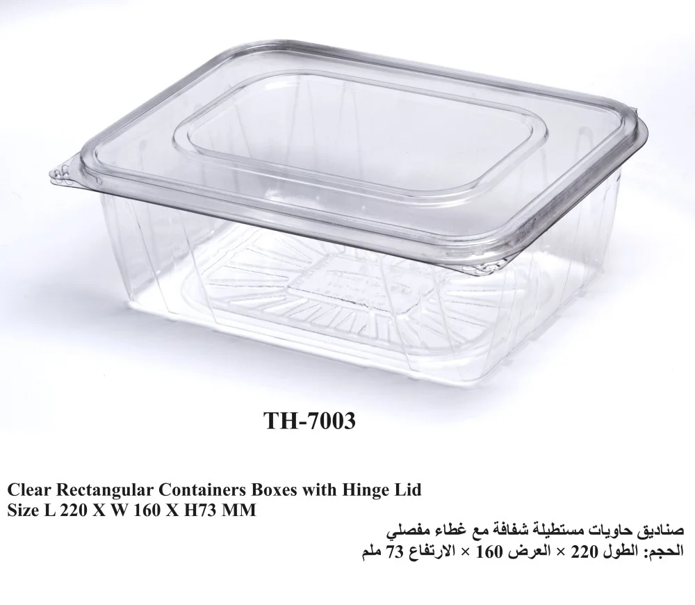 علب مستطيلة شفافة الحجم:العمق 220مم، العرض 160 مم، الارتفاع 73مم الكرتون=160 حبة رمز المنتج: TH-7003